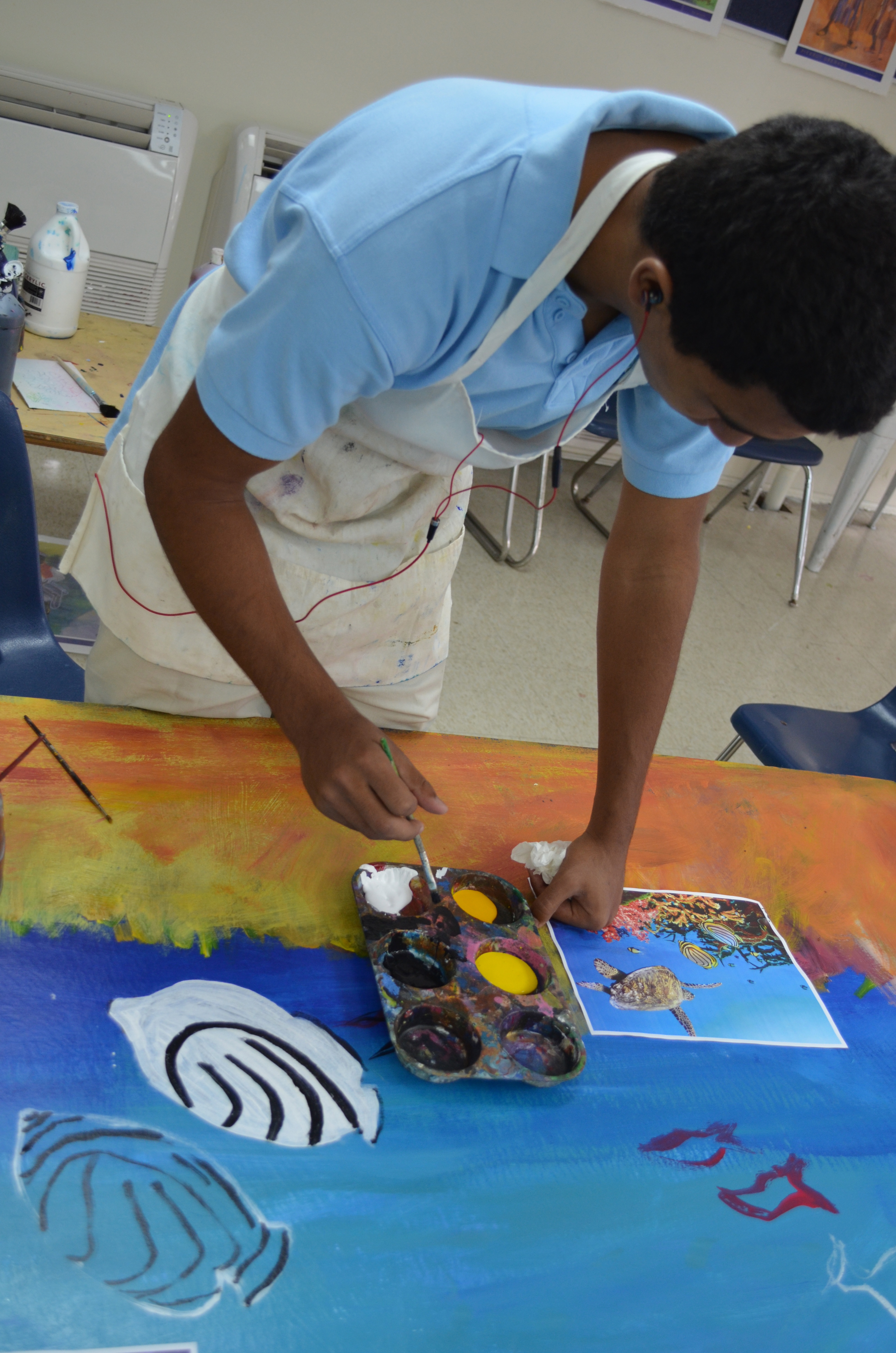 which is turning into more and more of a manifestation of our goal;  illustrating the United Nations theme of 2013, the Year of Water Cooperation.  We have been grappling with how to reduce our use of plastic as we digest the omnipresence as well as the omnipotency of the stuff. (If you haven’t already, I invite you to check out plasticoceans.net) We have students from kindergarten through to 12th grade working on the mural together, in the spirit of cooperation and shared responsibility.