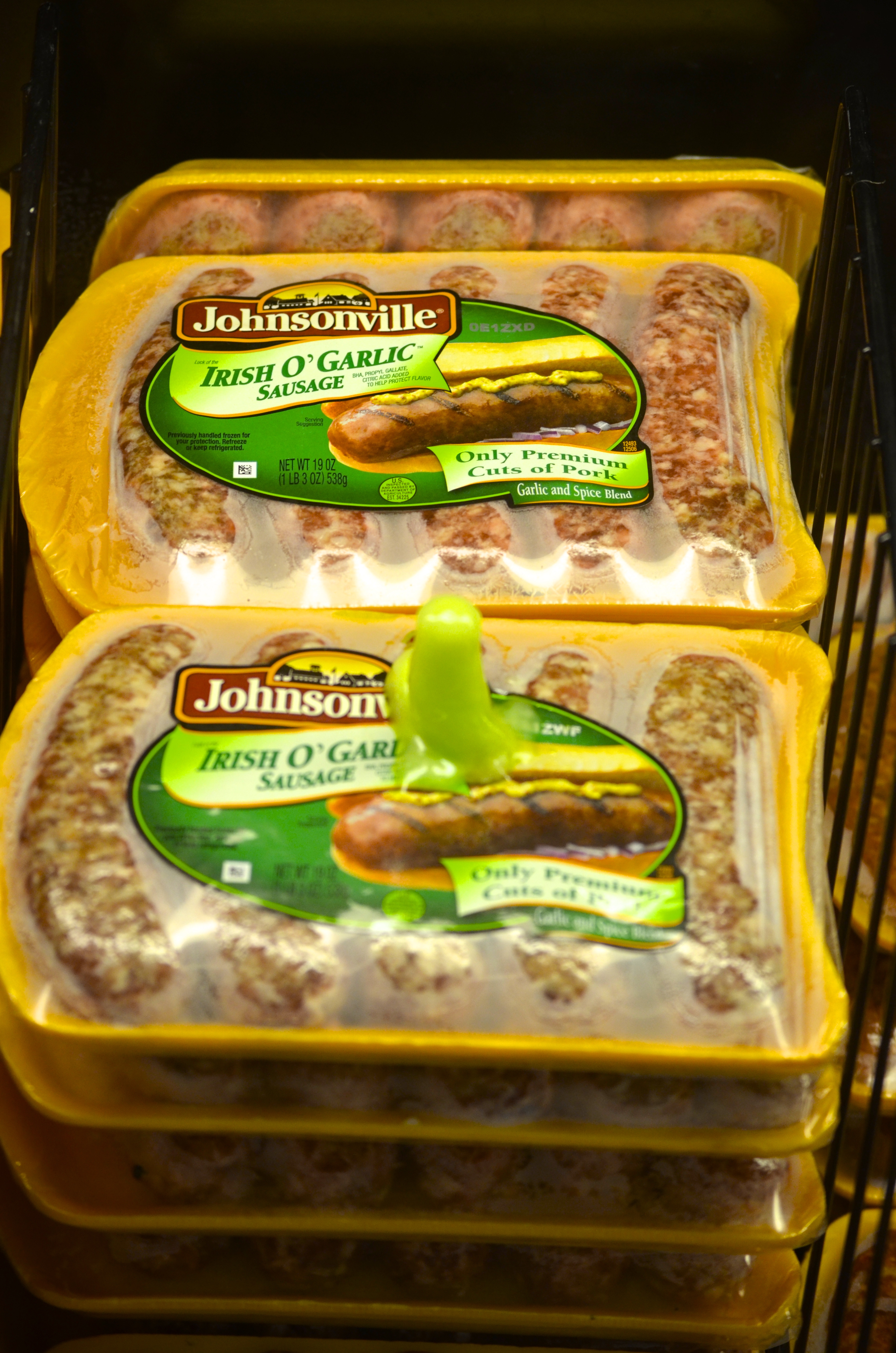 (These already unfortunate nitrate and fat sodden sausages had the added insult to injury of being underneath the neon green popsicle shelf during what appeared to be a power outage at the Hi Lo. )